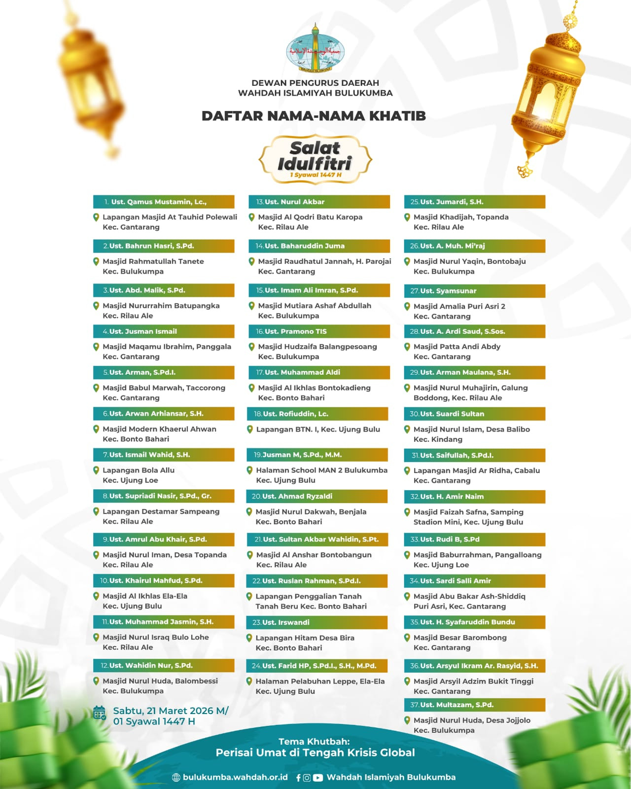 Bulukumba — Dewan Pengurus Daerah (DPD) Wahdah Islamiyah Bulukumba secara resmi merilis daftar nama-nama khatib untuk pelaksanaan Salat Idulfitri 1447 Hijriah. Penetapan ini menjadi bagian dari upaya memastikan pelaksanaan ibadah Idulfitri berjalan dengan khidmat, tertib, dan memberikan manfaat dakwah yang luas bagi masyarakat.