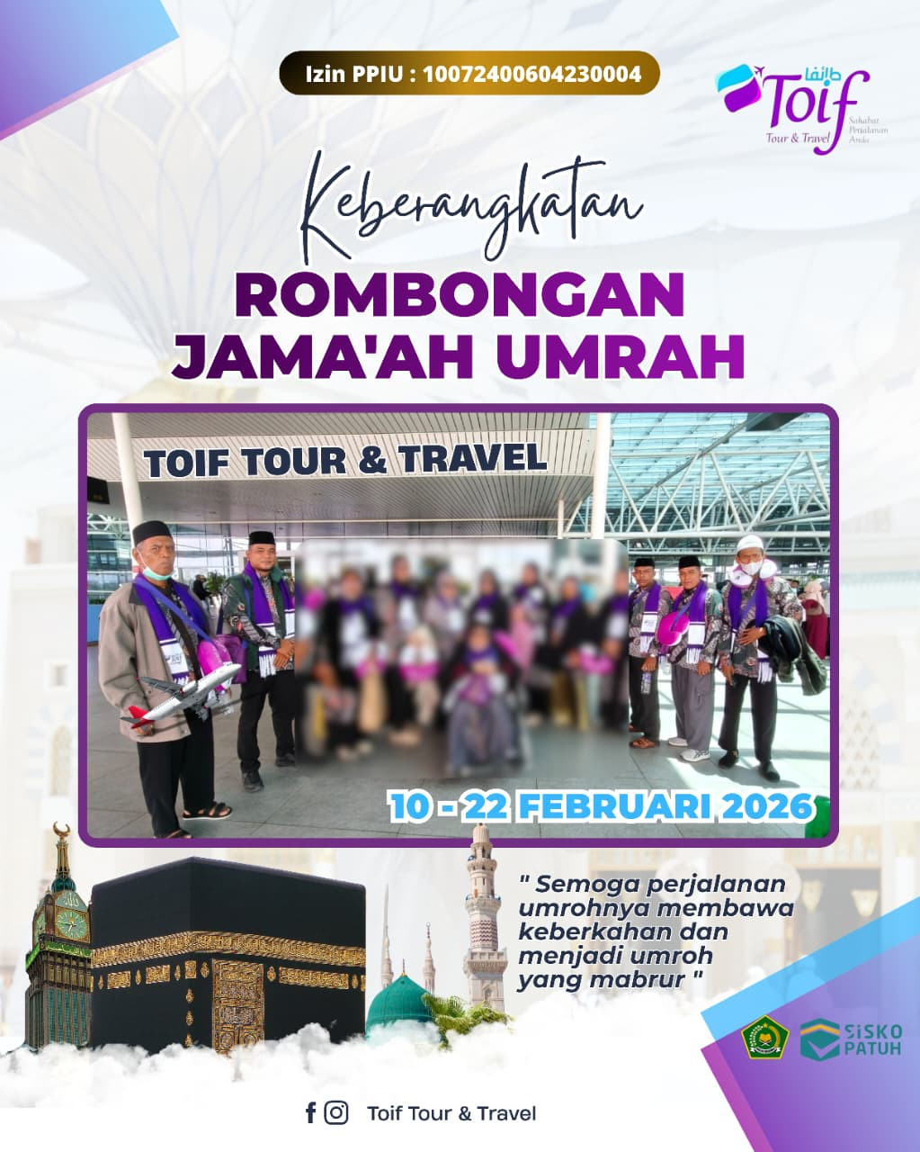 Sebagai informasi, Toif Tour and Travel merupakan penyelenggara perjalanan umrah yang berkomitmen menghadirkan layanan ibadah yang berkualitas, aman, dan berorientasi pada khidmat kepada jamaah. Bagi masyarakat yang ingin mendapatkan informasi lebih lanjut terkait program umrah Travel TOIF, dapat menghubungi kontak berikut https://wa.me/082248397493.