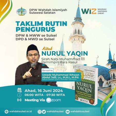 Makassar - Dewan Pimpinan Wilayah (DPW) Wahdah Islamiyah Sulawesi Selatan akan menggelar Taklim Online rutin bagi para pengurus pada hari Ahad, tanggal 16 Juni 2024. Acara ini bertujuan untuk memperdalam pengetahuan agama serta mempererat silaturahmi antar anggota.