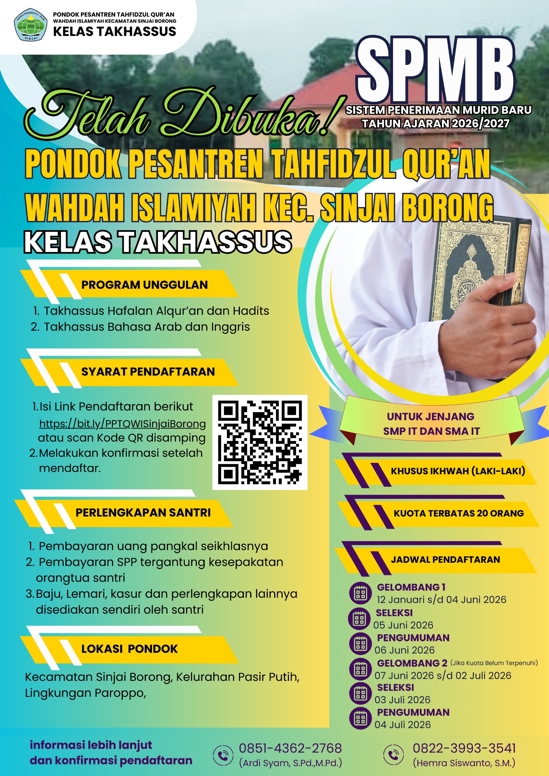 Sejalan dengan itu, Pondok Pesantren Tahfidzul Quran (PPTQ) Wahdah Islamiyah Kecamatan Sinjai Borong resmi membuka Sistem Penerimaan Murid Baru (SPMB) angkatan pertama Tahun Ajaran 2026/2027 untuk Kelas Takhassus, sebuah program unggulan dengan pembinaan intensif yang dikhususkan bagi santri ikhwah (laki-laki) dengan kuota terbatas.