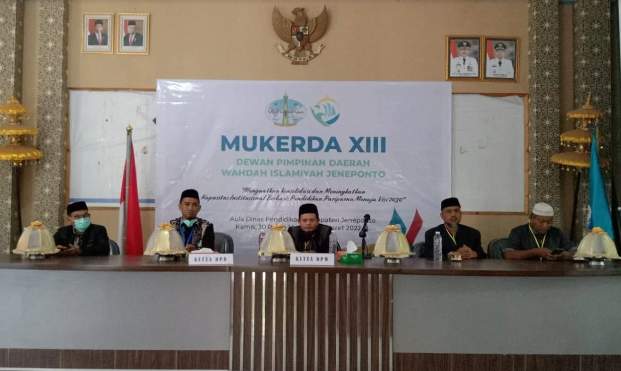 Musyawarah Kerja Daerah (Mukerda) XIII Dewan Pimpinan Daerah (DPD) Wahdah Islamiyah Jeneponto bertempat di Aula Dinas Pendidikan Kabupaten Jeneponto berjalan lancar (03/03/2022). Mukerda yang dilaksanakan setiap tahun ini bertujuan untuk mengevaluasi pencapaian program kerja sebelumnya dan menyusun serta memaparkan program kerja dakwah selanjutnya. Mengangkat tema “Menguatkan Konsolidasi dan Meningkatkan Kapasitas Institusional Berbasis Pendidikan Paripurna Menuju visi 2030.”